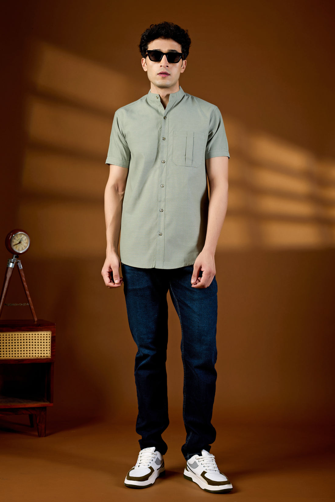 KEENLINE Men’s Sage Green Mandarin Collar Short Sleeve Shirt – Modern Smart Fit Casual Wear**
