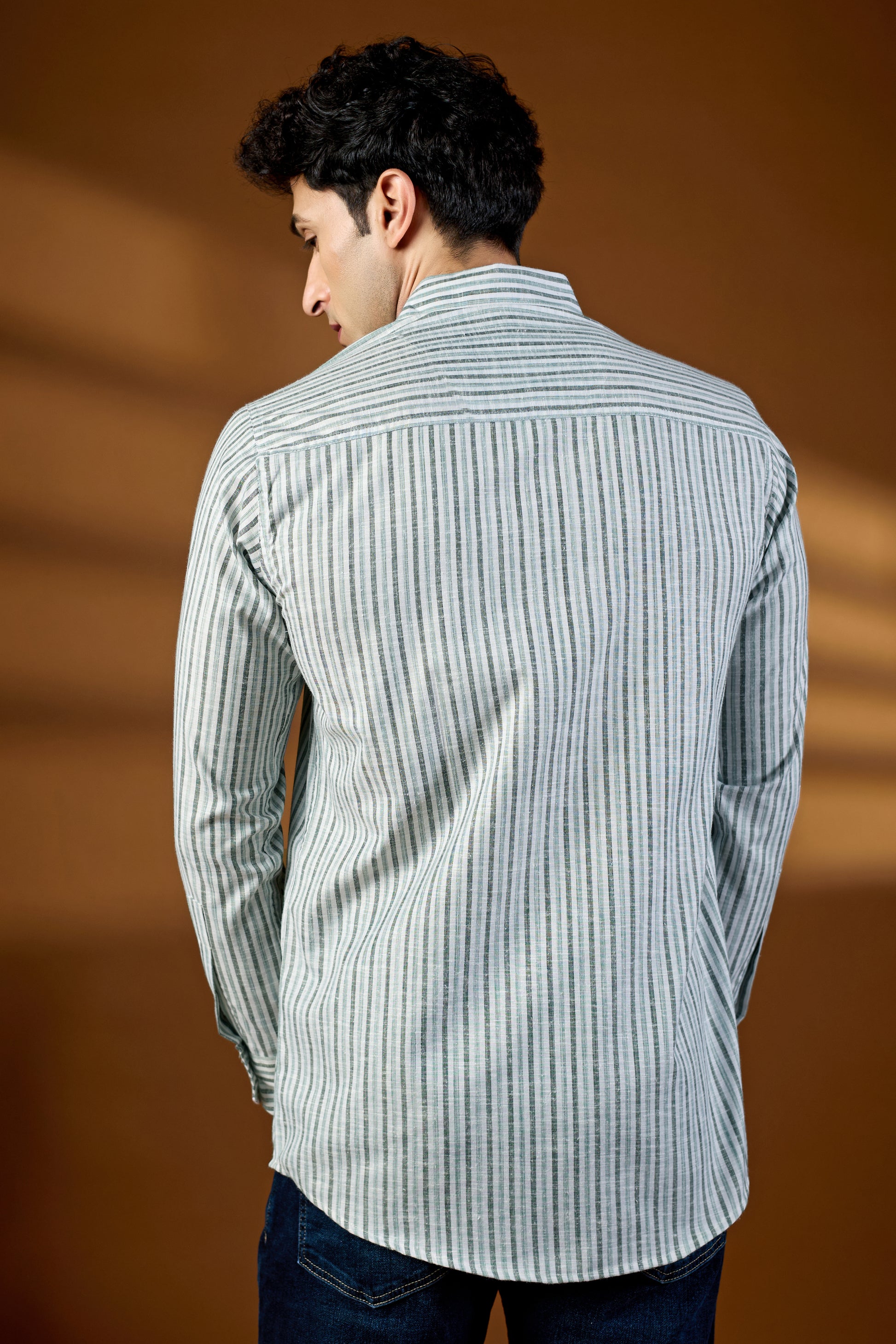Refresh your wardrobe with this elegant green and white striped shirt designed for the modern man. Featuring subtle vertical stripes and a clean, structured silhouette, this shirt delivers a refined look that works perfectly for both office and smart casual occasions.